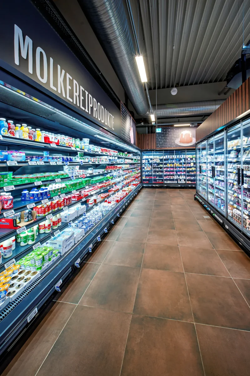 此外,AHT供應新型BOREA製冷機組並整合熱回收系統,結合大金Altherma熱泵以完全符合REWE的建築規範。製冷系統採用R290(丙烷)作為冷媒,熱泵則使用R32冷媒。